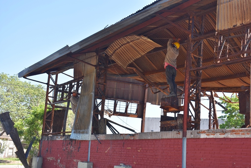 Los trabajos comenzaron con el desmontaje y demolición de todas las chapas de cierre y cubierta, procediendo al retiro de toda la estructura del techo, correas y cabreadas, y se quitarán las columnas centrales que sufrieron mayor deformación debido al fuego.