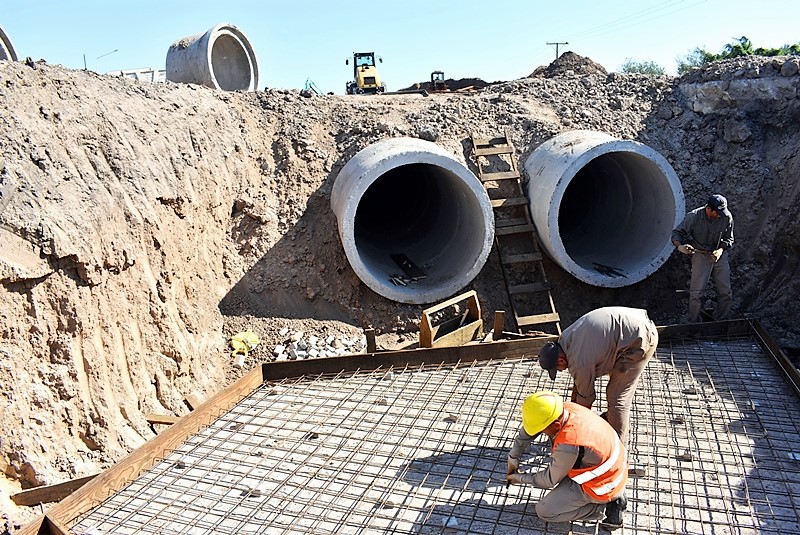 El Gobierno provincial avanza con la construcción del tendido de desagües pluviales de la avenida Nini Flores, en Santa Catalina, desde el acceso a la Escuela de Cadetes de la Policía hasta su cruce con la avenida Maipú. Ya se colocaron cerca de 500 tubos de 1,5 metros de diámetro de los 6.500 caños de hormigón armado que formarán este ducto de casi 2 kilómetros de largo.