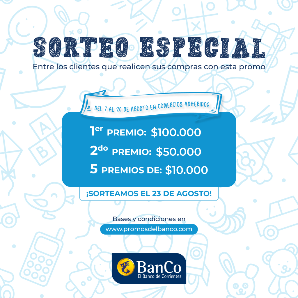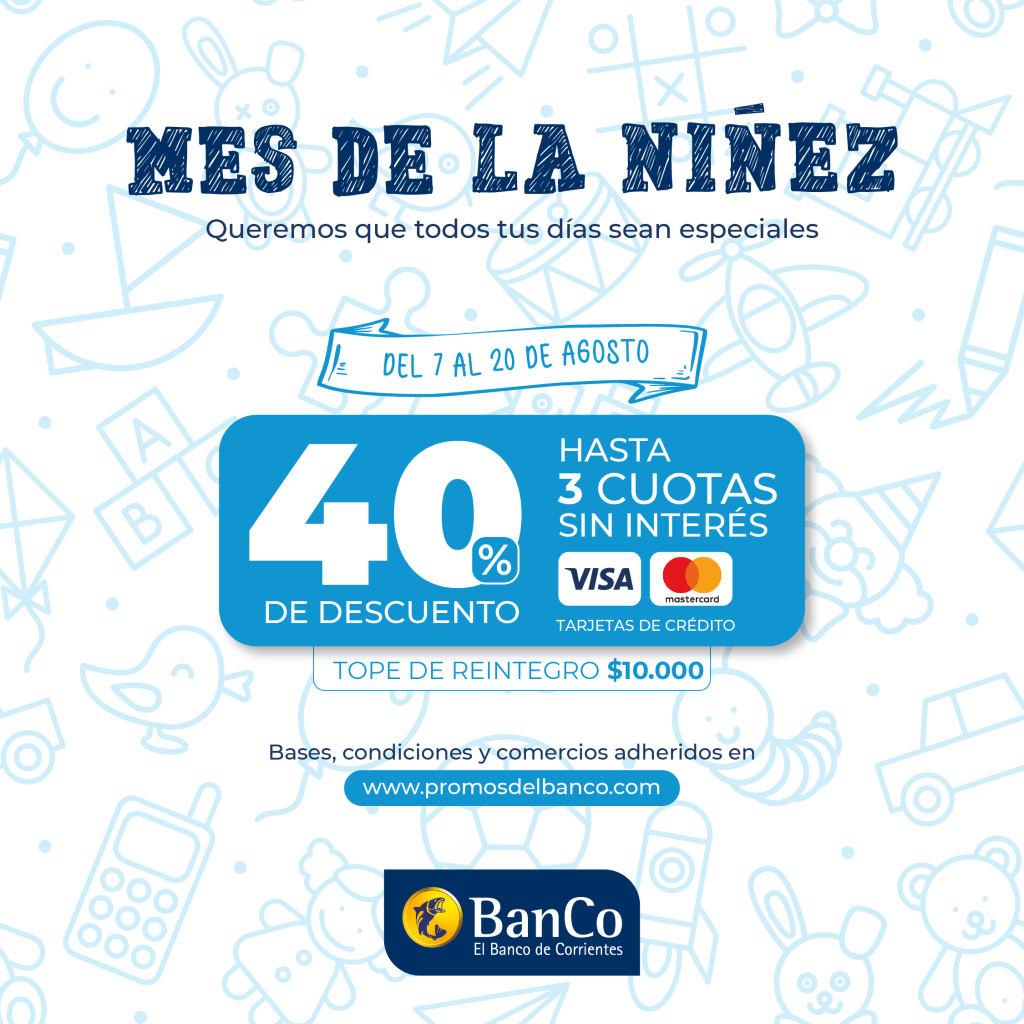 El Banco de Corrientes (BanCo) continúa brindando beneficios a sus clientes, con importantes descuentos todos los días. En esta oportunidad, del 7 al 20 de agosto será la promoción “Diversión sin límites” por el Mes de la Niñez, posibilitando un descuento del 40 por ciento en compras de hasta tres cuotas para clientes con tarjetas de crédito Visa y Mastercard, con tope de reintegro de 10.000 pesos por vigencia y por cuenta.