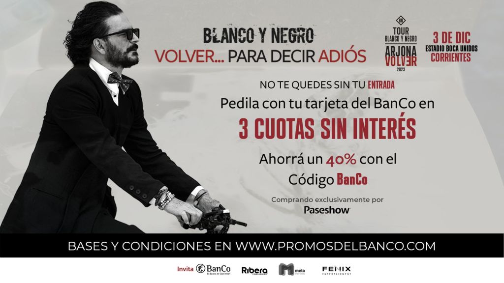 Los interesados podrán adquirir entradas para los sectores platea oeste alta, platea este y campo de pie en hasta tres cuotas sin interés y acceder a un descuento del 40 por ciento comprando desde la web de Paseshow, ingresando el código “BanCo”.