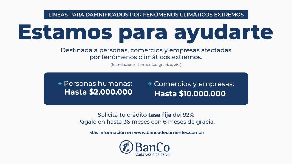 El Banco de Corrientes reafirma su compromiso con todos los sectores de la provincia e impulsa una importante línea de apoyo en el actual contexto que atraviesan diferentes regiones afectadas por fenómenos climáticos extremos que produjeron pérdidas materiales significativas en localidades.