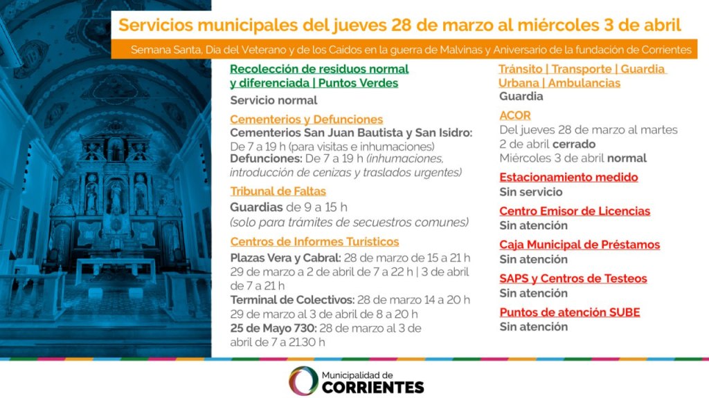 La Municipalidad de Corrientes informó acerca del funcionamiento de los servicios a su cargo durante los próximos días inhábiles, teniendo en cuenta el asueto de este jueves 28 y feriado del próximo viernes 29 por Semana Santa. A estos se suman los feriados del 1 de abril, con fines turísticos, del 2 de abril por el Día del Veterano y de los Caídos en la Guerra de Malvinas, y del miércoles 3 de abril, que es feriado municipal por la conmemoración del 436º aniversario de la fundación de la Ciudad de Corrientes.