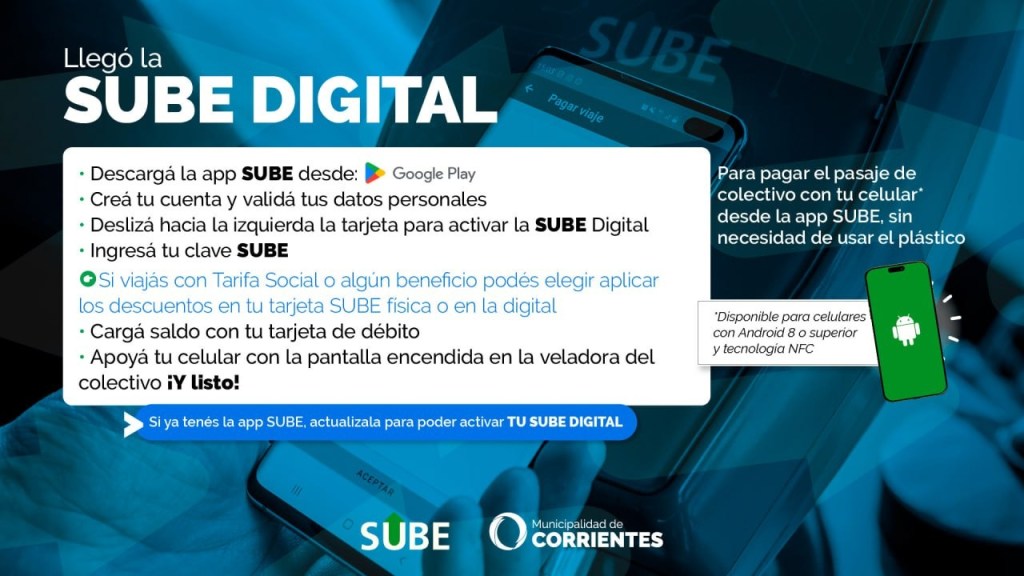 La Municipalidad de Corrientes informó que comenzó la activación de la tarjeta SUBE Digital, para que los pasajeros que viajan en colectivo puedan pagar directamente desde el celular.