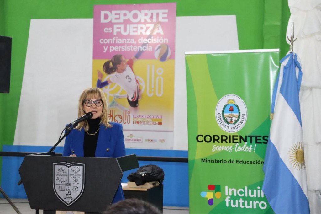 “Traigo los saludos del gobernador Gustavo Valdés, que no pudo estar presente por cuestiones de agenda, pero su compromiso está cumplido”, dijo la ministra durante la entrega de notebooks y equipamiento escolar, realizada en el establecimiento educativo.