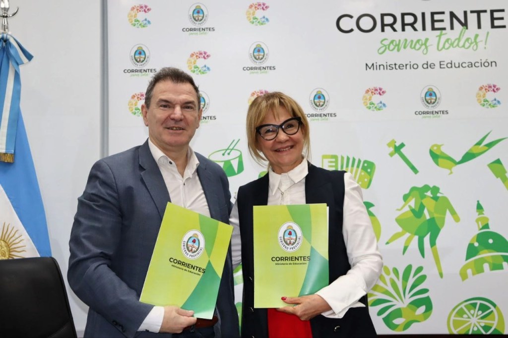 La ministra de Educación, Práxedes López y el interventor de Lotería Correntina, Héctor Javier Bee Sellares, firmaron un convenio de colaboración entre el Instituto de Loterías y Casinos de Corrientes y la cartera educativa, con el objetivo principal de promover el juego responsable entre los estudiantes de escuelas primarias y secundarias.