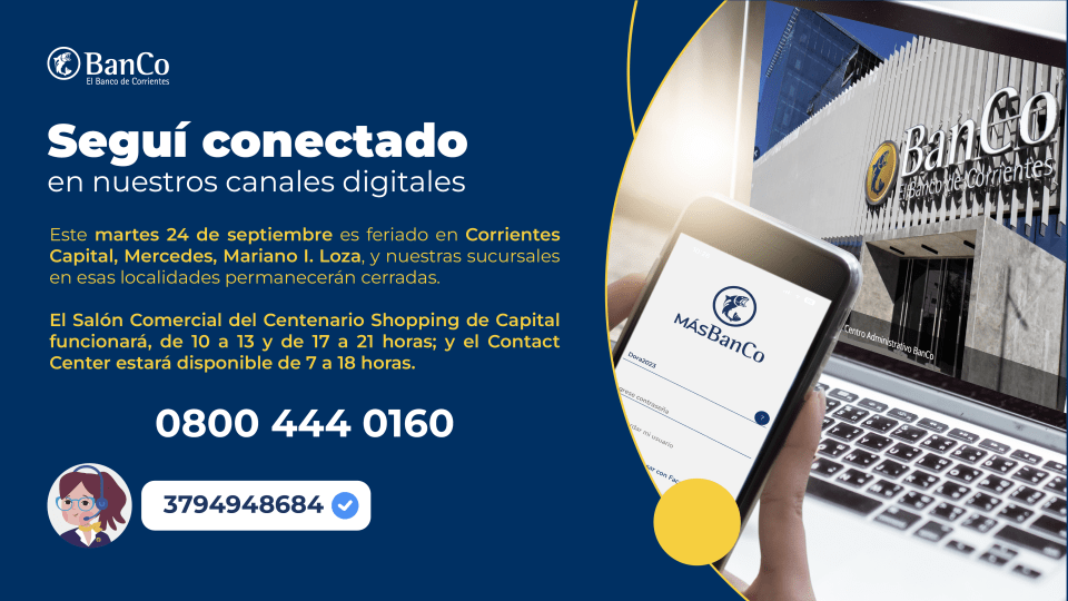 Con motivo de conmemorarse el Día de la Virgen de la Merced este martes 24 de septiembre, el Banco de Corrientes SA no atenderá al público en las sucursales de Mercedes, Mariano I. Loza y Capital, con excepción del Salón Comercial del Centenario Shopping Mall.