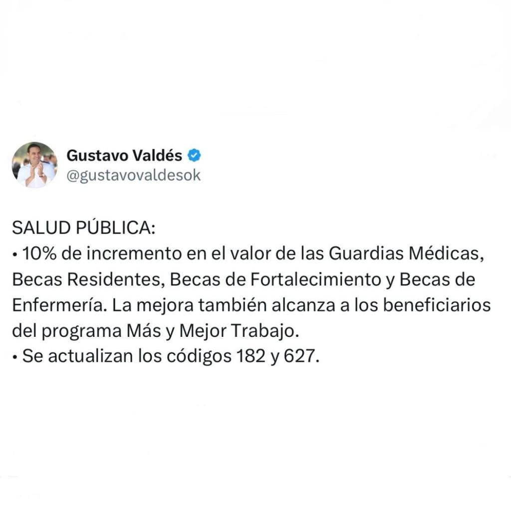 En Salud Pública, para las guardias médicas, el aumento es de 10%; el mismo incremento para los residentes (provinciales y nacionales), becas de fortalecimiento y becas de enfermería. Esta mejora alcanza a los beneficiarios del programa Más y Mejor Trabajo.