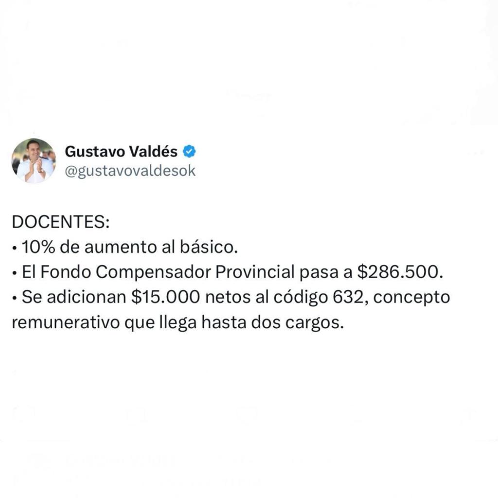 En el sector Docente, el aumento al básico es de un 10%. También, el fondo compensador provincial docente se incrementa en $ 35.000, pasando a la suma de $ 286.500 (hasta septiembre fue de $ 251.500). También, se adicionan $ 15.000 netos al código 632 complemento docente provincial; concepto remunerativo que llega hasta dos cargos.