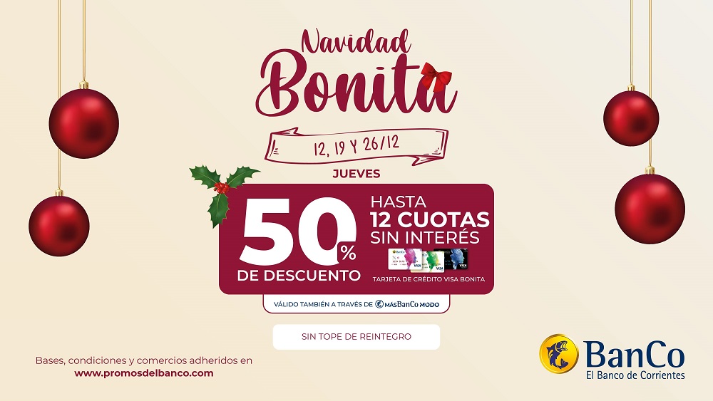 Finalmente, se incorpora una promoción especial con la tarjeta de crédito Visa Bonita del BanCo, “Navidad Bonita”, que ofrecerá un 50% de descuento sin tope de reintegro, en hasta 12 cuotas sin interés, los días jueves 12, 19 y 26 de diciembre, en todos los comercios adheridos a la promo habitual los días jueves. Son más de mil comercios los que se encuentran adheridos a este beneficio.