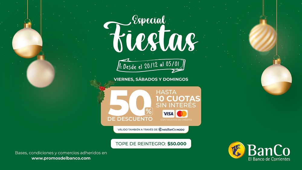 Con más de 600 comercios adheridos, la promo “Especial Fiestas” abarcará los rubros indumentaria, ópticas, zapaterías, marroquinerías, perfumerías, librerías, estéticas, jugueterías, bicicleterías, artículos de decoración, bazares, entre otros. Estará vigente los días viernes, sábados y domingos, desde el 20 hasta el 5 de enero inclusive. El beneficio será del 50% de reintegro, con tope de $ 50.000, para compras en hasta 10 cuotas sin interés con todas las tarjetas de crédito Visa y Mastercard del Banco de Corrientes.