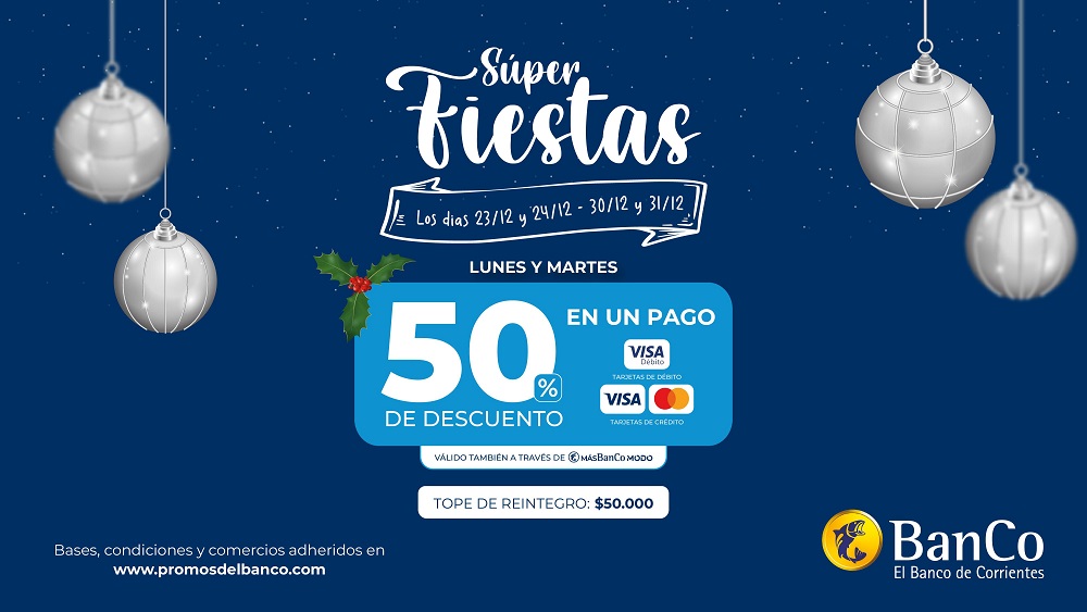 Supermercados, carnicerías, bodegas y comercios afines adheridos contarán con la promoción “Super Fiestas”, donde se ofrecerá un 50% de descuento, con tope de reintegro de 50.000 pesos por vigencia y por cuenta. La promo alcanza a las compras que se realicen los días 23 y 24, 30 y 31 de diciembre, en los más de 230 locales adheridos, abonando en un pago con tarjetas de débito y de crédito Visa y Mastercard del Banco de Corrientes.