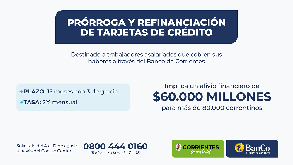 Por un lado, se presentó la prórroga y refinanciación de tarjetas de crédito con plazo de hasta 15 meses, 3 meses de gracia y tasa del 2 por ciento mensual. La medida está destinada a asalariados públicos y privados que cobren sus haberes a través del Banco de Corrientes.