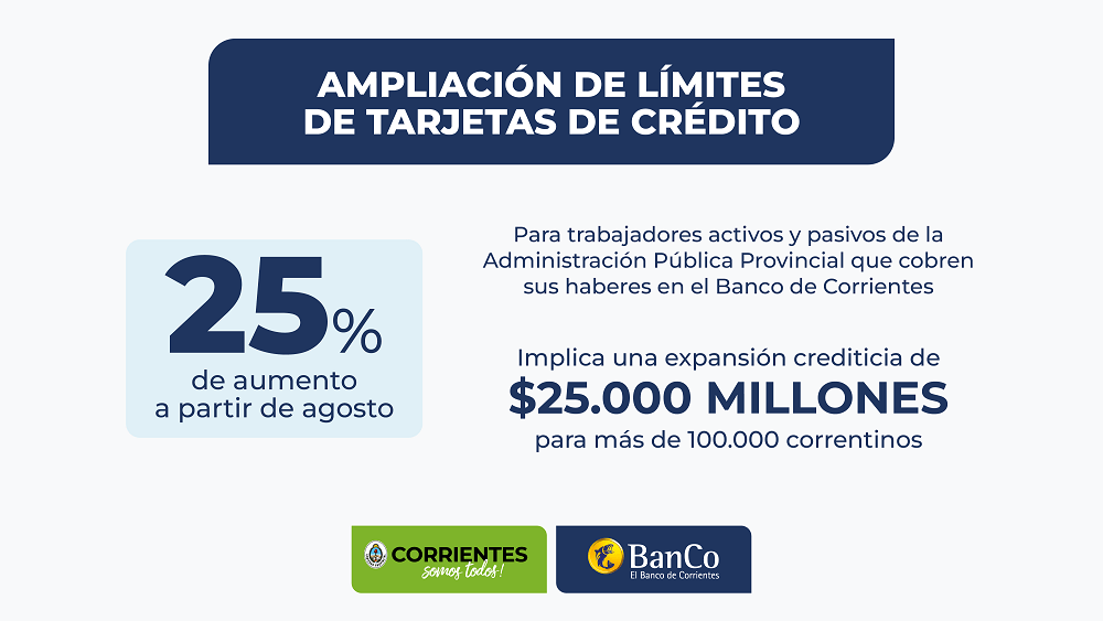 También se implementará un aumento de límites de las tarjetas de crédito, el cual será del orden del 25% para todos los trabajadores activos y pasivos de la administración pública provincial que perciban sus haberes en el Banco de Corrientes, siempre que su límite disponible actual no supere los $6.400.000. Esta medida regirá a partir de agosto, alcanzará a 100.000 personas, con una inversión total de $ 25.000 millones.