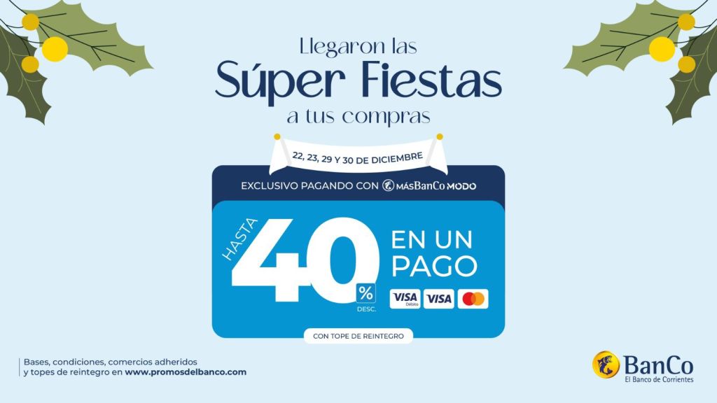 El Banco de Corrientes recuerda que rige la promoción “Súper Fiestas”, una de las acciones más esperadas por las familias correntinas para realizar las compras de fin de año con importantes beneficios. La propuesta estará disponible los días 22, 23, 29 y 30 de diciembre, en supermercados, carnicerías, bodegas y comercios afines adheridos en toda la provincia.
