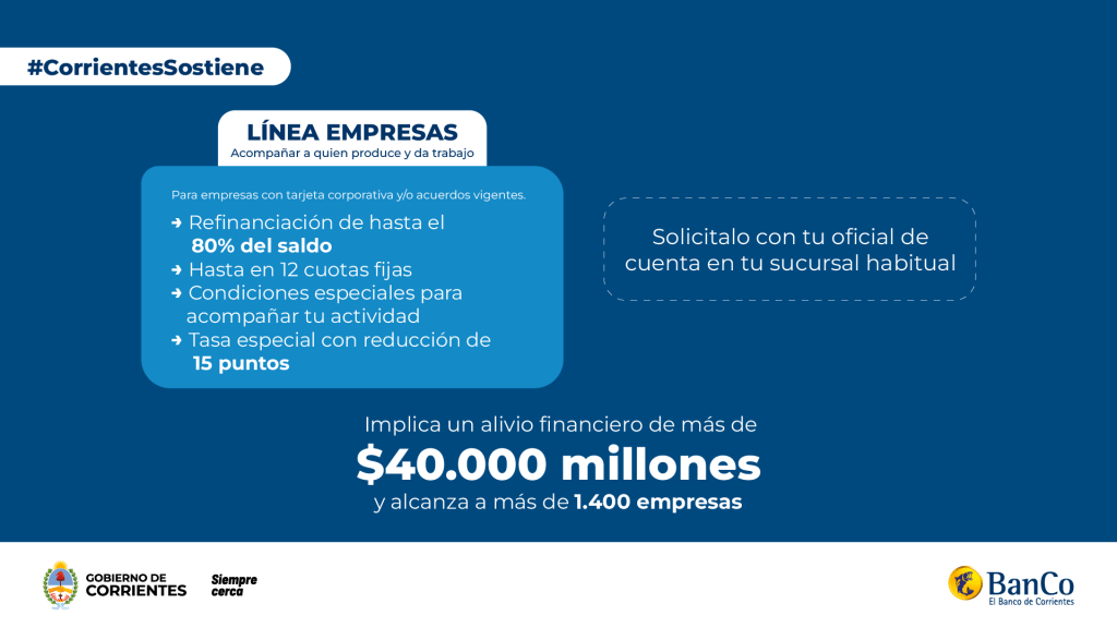 Esta iniciativa generará un alivio financiero estimado en más de $ 40.000 millones, en beneficio de más de 1.400 empresas correntinas. Las solicitudes deberán gestionarse a través de las sucursales del banco, con el oficial de cuenta habitual.