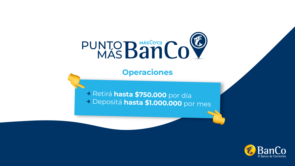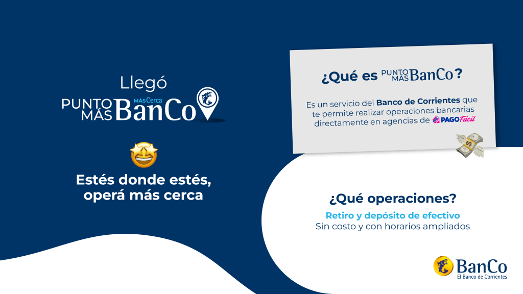 Con el objetivo de ofrecer mayores alternativas al momento de realizar operaciones bancarias esenciales, el Banco de Corrientes (BanCo) presenta Punto MÁSBanCo, un nuevo servicio que permite a sus clientes realizar extracciones de hasta 750.000 pesos por día y depósitos de hasta $ 1.000.000 por mes directamente en los locales de Pago Fácil distribuidas en todo el territorio nacional.